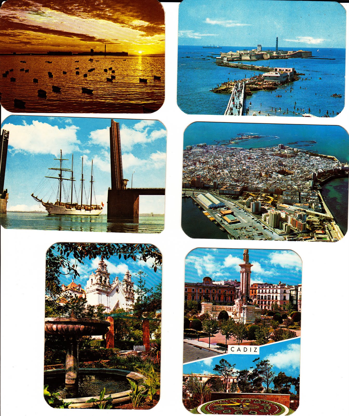 9.- Atardecer en La Caleta con vista del Castillo de San Sebastían y del faro, 10.- Vista del arrecife de la Caleta y Castillo de San Sebastián con el faro; 11.- El navío Juan Sebastian Elcano pasando bajo el Puente Carranza, 12.- Vista Aerea del Casco Antiguo de Cádiz desde la Punta de San Felipe; 13.- Fuente de La Alameda y al fondo Iglesia del Carmen, 14.-Composición postal con vista del monumento a La Constitución de 1812 y al fondo la Diputación y el reloj floral.